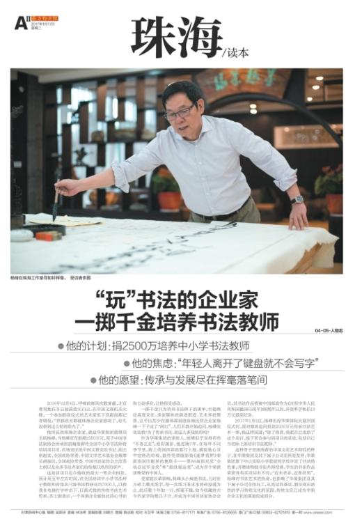 一擲千金只為培養書法種子的善舉,引起輿論高度關注。多家媒體的跟進報道、藝術界的贊譽,讓平日甚少在媒體露面的珠海民營企業家楊峰一下子成了“網紅”。人們不禁開始追問,楊峰究竟是誰?為了傳承書法,花這么多錢值得嗎?