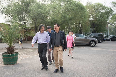 中國書法家協會“翰墨薪傳”學術指導小組副主任、華策集團董事局主席楊峰(左二)與中國書法家協會主席蘇士澍(左三)討論“翰墨薪傳”項目未來發展事宜