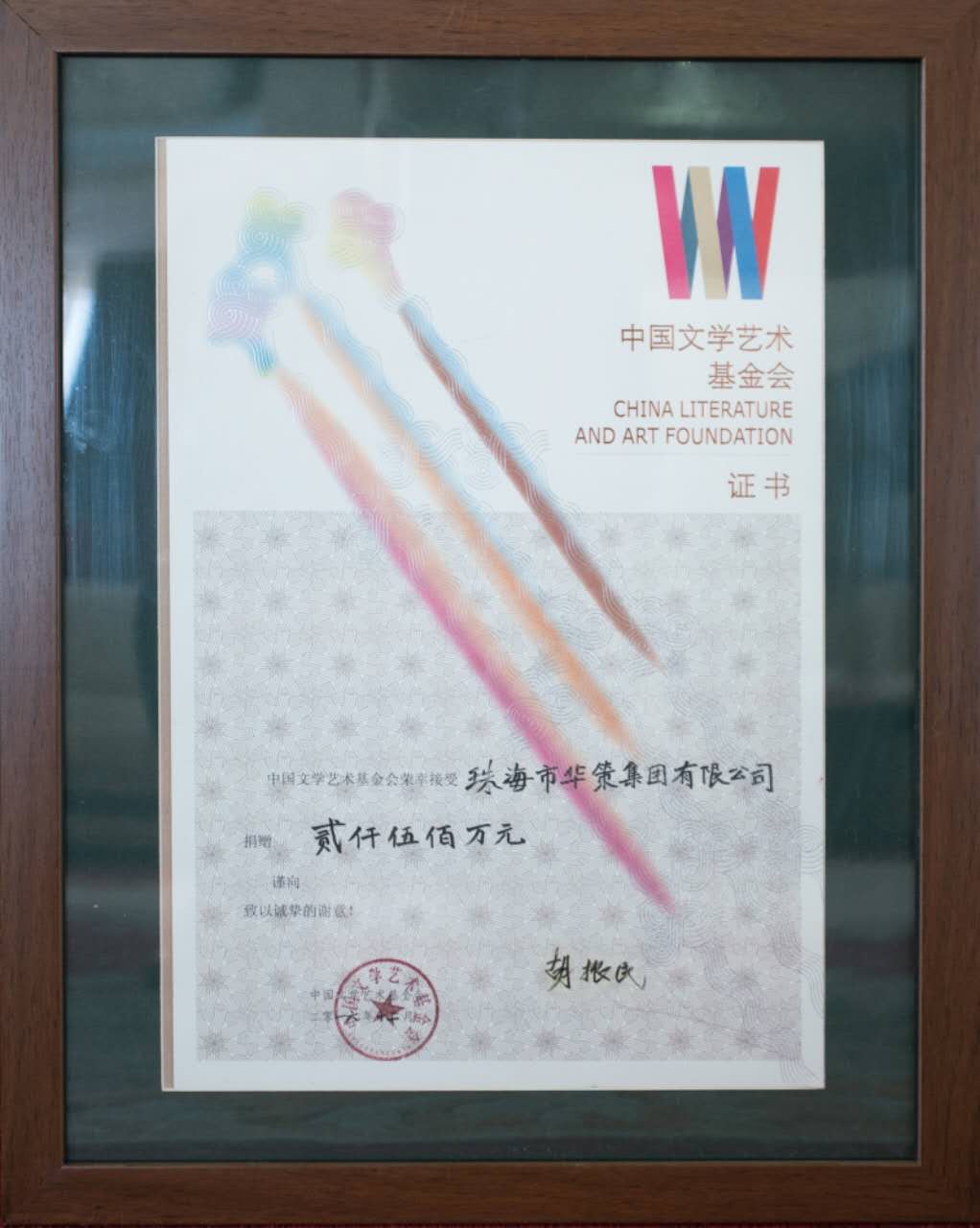2016年12月8日15時,華策集團與中國文學藝術基金會、中國書法家協會在北京中國文聯機關大樓舉辦捐贈簽約儀式。華策集團正式向中國文學藝術基金會捐贈2500萬元,用于中國書法家協會所承擔的翰墨薪傳全國中小學書法師資培訓項目。華策集團董事局主席楊峰、董事行政總監趙日云代表華策集團參加了捐贈儀式并領取捐贈證書。