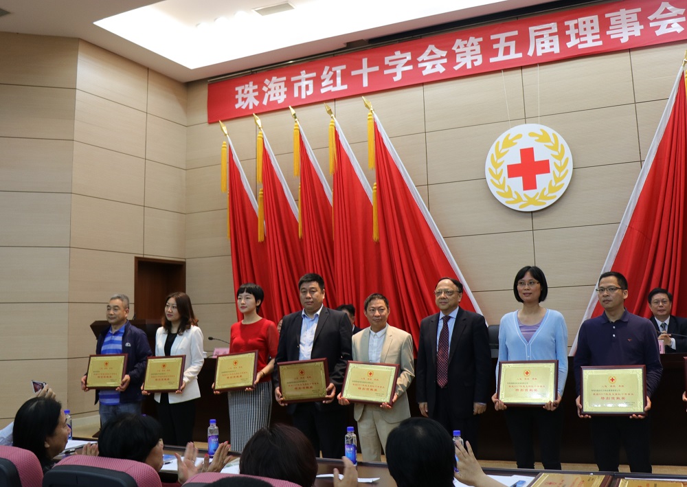 珠海市副市長(zhǎng)、市紅十字會(huì)會(huì)長(zhǎng)閻武(右三)為愛心企業(yè)頒獎(jiǎng)